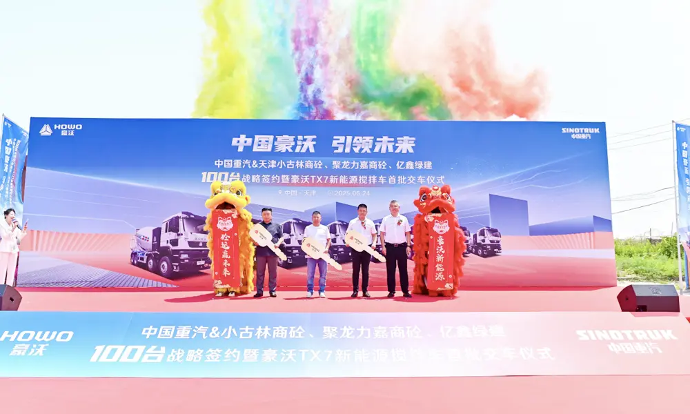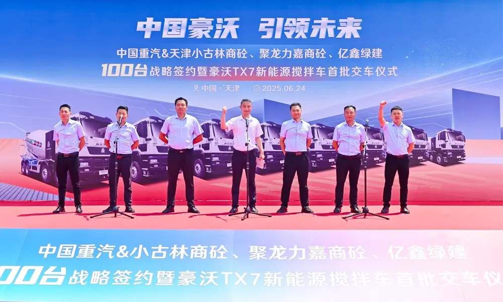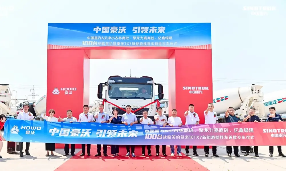 On June 24, 2025, Sinotruk, together with Tianjin Xiaogulin Ready-Mixed Concrete, Julong Lijia Ready-Mixed Concrete, and Yixin Green Construction, held a grand “China HOWO, Leading the Future” strategic signing ceremony and the first delivery of HOWO TX7 new energy concrete mixer trucks in Tianjin, on the shores of the Bohai Sea. Guided by the “Dual Carbon” strategy, the event focused on green urban construction and new energy ready-mixed concrete. The signing of a strategic cooperation agreement for 100 new energy concrete mixer trucks and the completion of the first vehicle delivery marked a new stage in the development of Tianjin’s green infrastructure system.